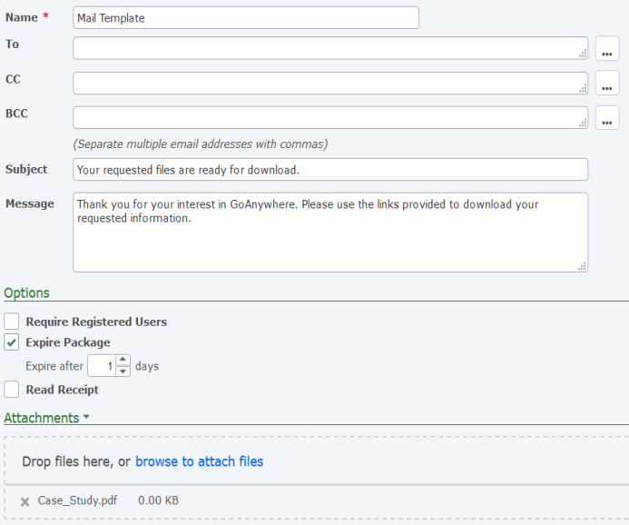 The Add Template page is where mail templates are designed. Specify mail package recipients in the To field, and optionally, the CC or BCC fields. Specify a subject to appear in the email and an optional message. You can then specify security options and add files to the mail template.